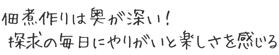 これまで勤めていた企業は、上司との距離があって、どうしても馴染むことができませんでした。その点当社は社長とも距離が近く、とても話しやすい雰囲気です。また一人ひとりをきちんと見てくれているので、安心して仕事に取り組めます。人間関係の良さは当社の最大の魅力だと思います。今はまだ、任された商品を確実に作れるようになることが課題ですが、その次は当社が扱う全商品が作れるよになることを目標にしています。まだまだ食品に関する基本的な知識が足りないと思っていますので、目の前のことを確実にやりながら、新しいこともどんどん吸収していきたいと思います。佃煮作りは奥が深いですから、追求していきたいと考えています。