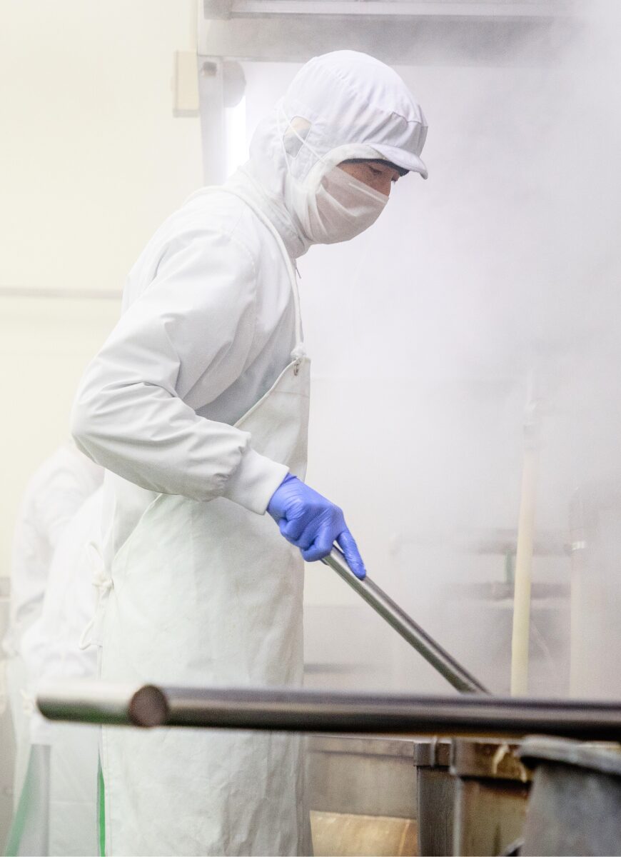 当社の商品はすべて手作りのため、原料の状態によって炊く時間や分量などの調整をしなければなりません。いつも同じ味で、安定した商品を作ることが一番難しいところです。大変ではありますが、生産スケジュールを見て、自分で計画を立てて仕事を進めることができます。工場長も全体は見ていますが、細かな作業行程などに関してはすべて任されているので、自分で作っているという実感があります。最近では急な注文が入るなどイレギュラーなことがあっても、自分で段取りを調整して対処できるようになり、成長を感じています。