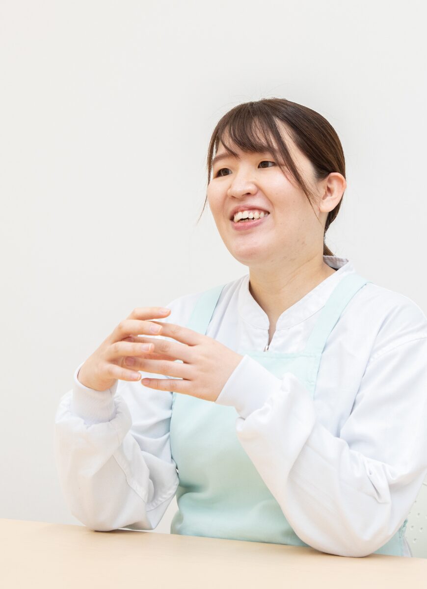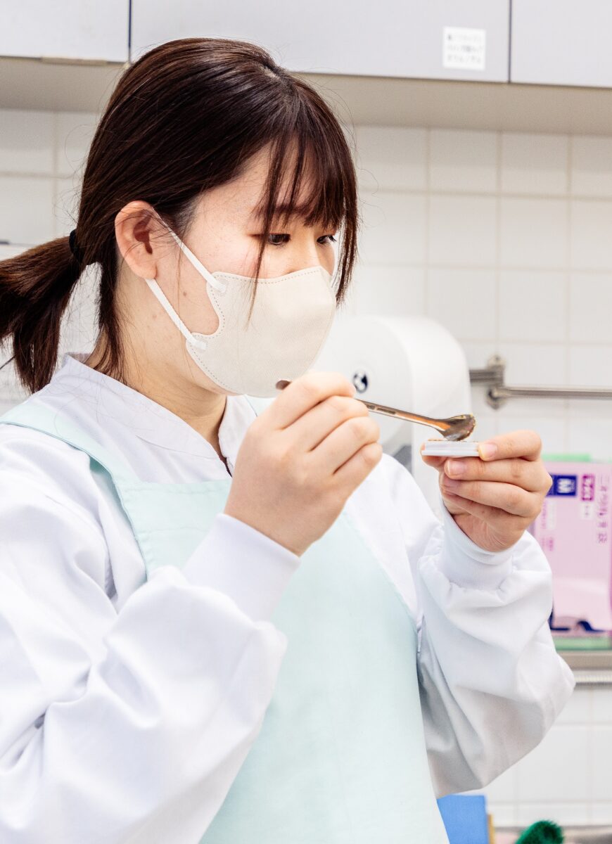 就職活動中は、地元企業で食品開発の仕事をしたいと考えていました。在学中に取得した管理栄養士の資格を活かすことができると思っていたからです。当社は品質管理と並行して食品開発にも携わることができる環境だったので、すぐに入社を希望しました。それに加えて、面接では暖かく親密な社風や風土を肌で感じることができたので、その点が大きな後押しとなり入社を決意しました。現在は製造工程における製品チェックや包装機械での作業、製品の計量作業、年に1回開催される展示会に向けたアレンジレシピの考案などを行っています。また、HACCP(ハサップ)システムの見直しと構築にも携わっています。